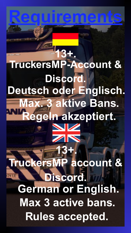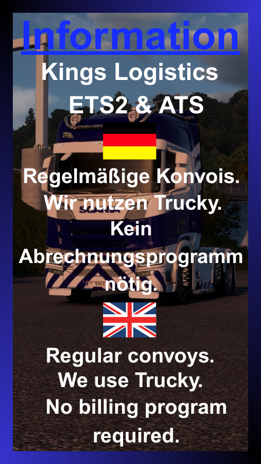 👑 Kings Logistics rekrutiert Fahrer & Team! Validated VTC (ETS2/ATS), inklusiv & anfängerfreundlich. Vorteile: kein km-Zwang, Logging optional, regelmäßige Convoys, exklusive Mods & Save-Edits, Ränge; Teamrollen nach 1 Woche. Anforderungen: Kings-Tag ingame, respektvoll, TMP/Server-Regeln, 13+, TMP & Discord, max. 3 aktive Bans. ➡️ Discord: [https://discord.gg/z6TXb4BtJj](https://discord.gg/z6TXb4BtJj) • VTC: [https://truckersmp.com/vtc/64284](https://truckersmp.com/vtc/64284)