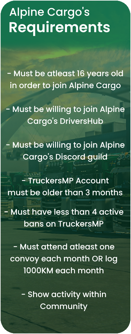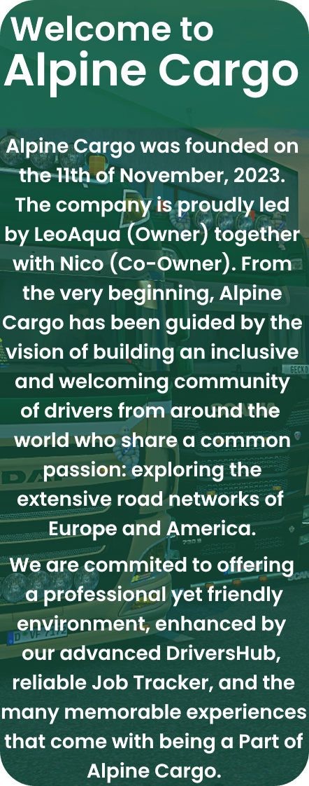 The events Alpine Cargo attends in TruckersMP can be added to your calendar! Events are in the iCal format, and will work with the vast majority of calendar applications.